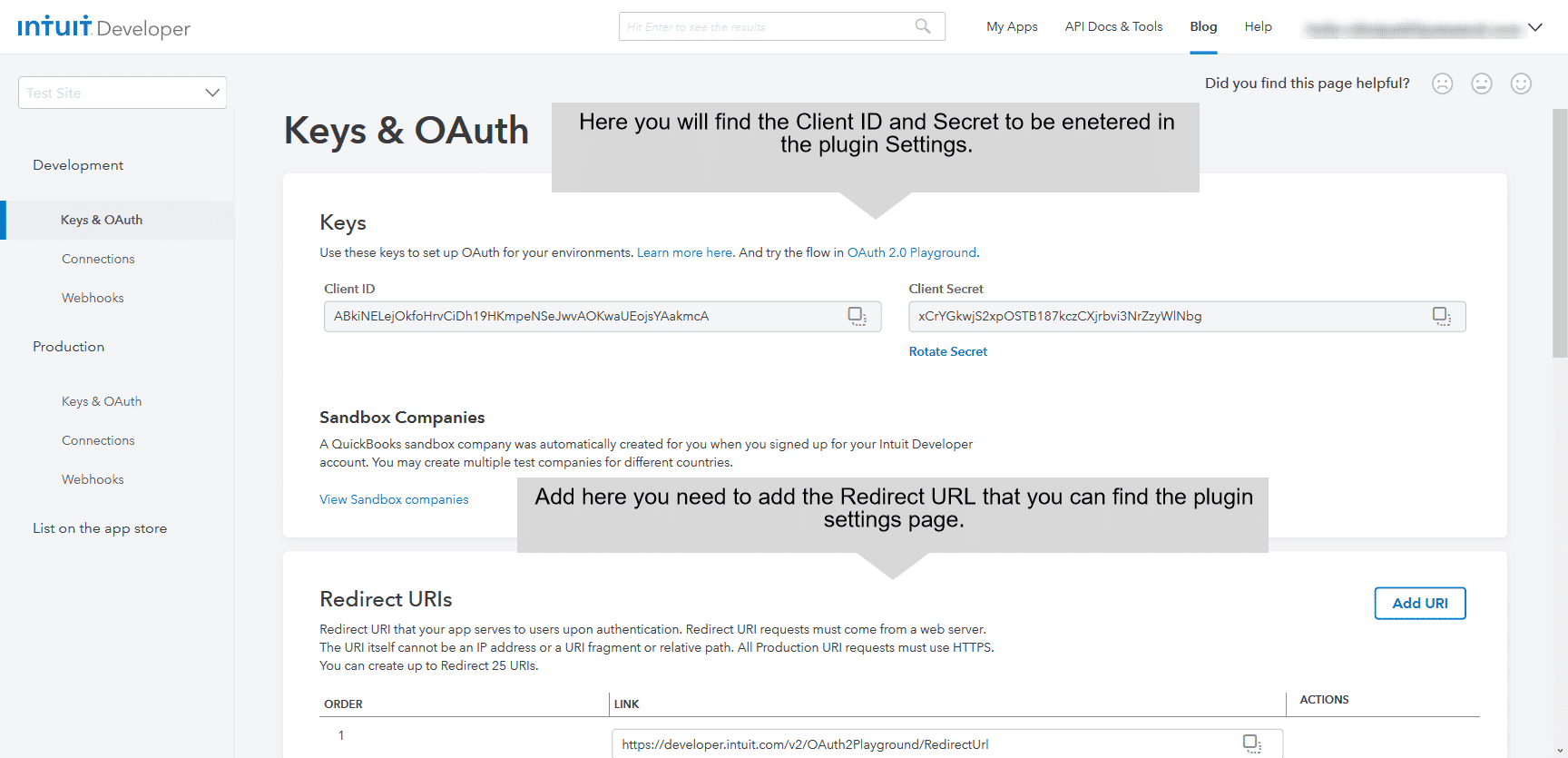 - Note the Client ID and Client Secret on the Keys & OAuth Page as you will need this to be entered on the plugin Settings page. As for the Redirect URL, you will find the plugin-specific url in the plugin Settings page. If you are unable to locate it please contact plugin support.