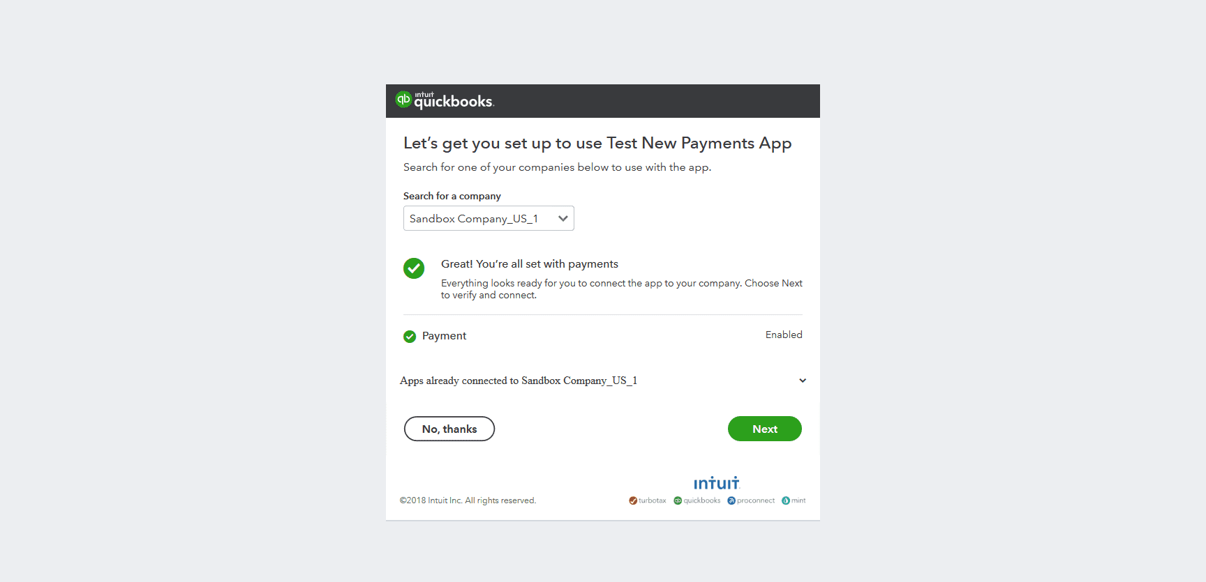 You need to test the QuickBooks payment system before Processing “Live Transaction”. If you don’t have Sandbox Account you can register for it here.