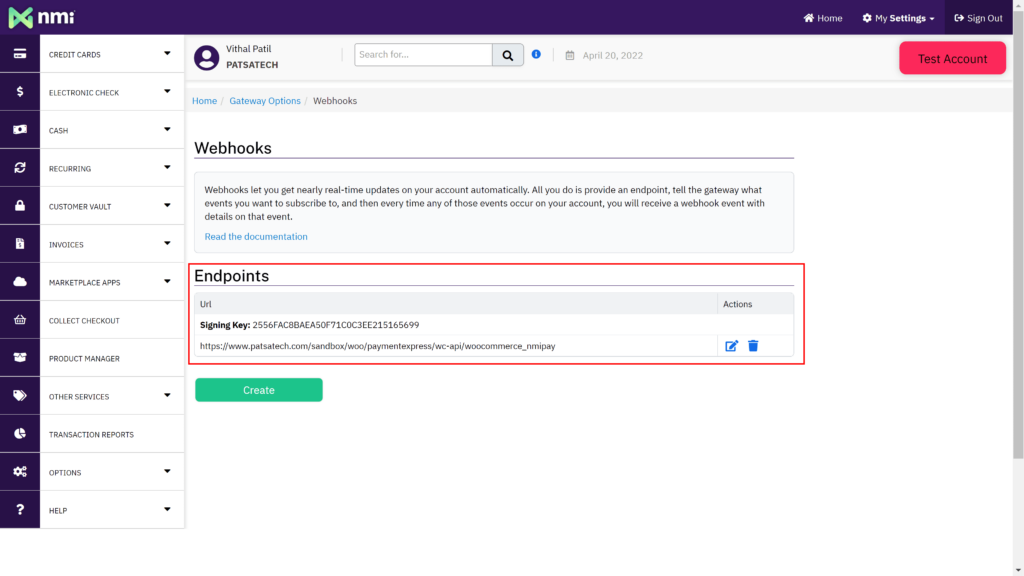- On webhooks page under Endpoints you need to create a new endpoints by clicking Create.